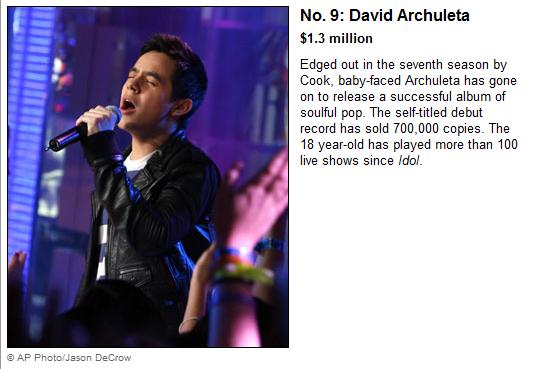 A revista Forbes publicou a lista dos Idols mais lucrativos da história. David ficou em 9 lugar, com $1.3 milhões de receita gerada.